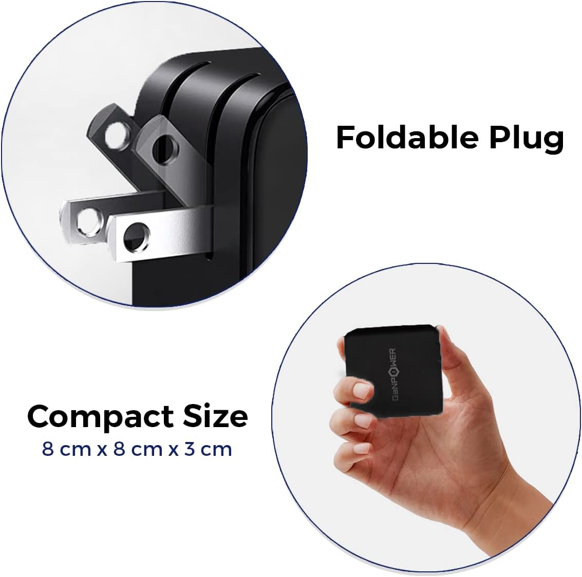 - GaNPower のデザインはコンパクトで、折りたたみ式プラグ設計を採用しています。当社のPDアダプタのサイズは、わずか8cm(高さ) x 8cm(長さ) x 3cm(幅)です。